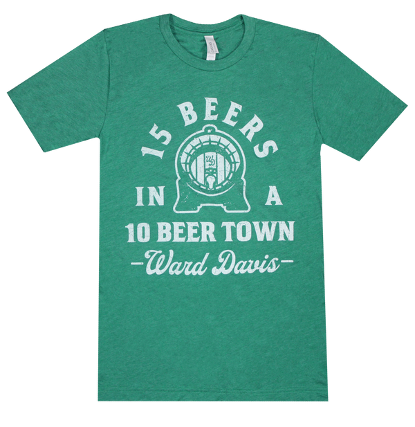Soft Bella triblend shirt in kelly green. 15 Beers in a 10 Beer Town